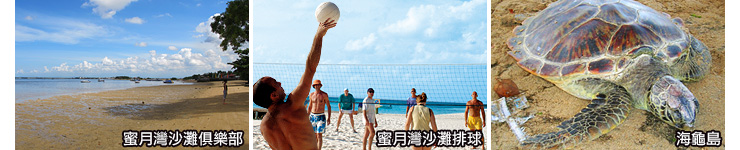 前往蜜月灣唐絨貝諾亞海灘,您可自費參加各項水上活動,如拖曳傘、水上摩托車、香蕉船等,另外於沙灘邊可自費享受一下沙灘按摩、編上一頭傳統髮瓣,體驗一下不同的巴里渡假風情。之後搭乘玻璃底船,出海觀賞美麗珊瑚,並在海龜島上騎大海龜,與大蜥蜴、蝙蝠合照,還有難得一見的鬥雞,是最讓旅客投入、聲嘶力竭的娛樂。