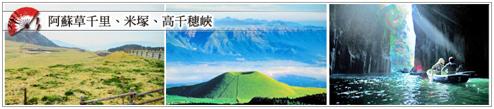 第 2 天    福岡-火山特殊景觀、純淨的絕色風光《阿蘇草千里》-日本傳說中的神祕遺蹟《米塚》-飛瀑絕壁、幽靜深邃的人間仙境《高千穗峽》-高千穗酒場-馬背-一望無際的湛藍天際線《日南海岸》-宮崎