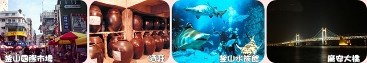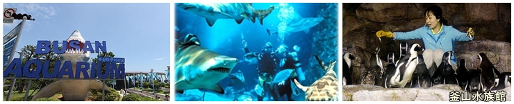 ★【釜山水族館】─釜山水族館共展示著250餘種35000餘尾深海魚類,包括分不同主題的40多個小水 族館、長達80公尺的海底隧道,以及可直接觸摸海底生物的觸摸體驗場等設施。此外還有熱帶雨林生態館、 水獺展示館、企鵝展示館、海蟄展示館、深海生物館等充滿趣味的各種展示館。 ◎【人蔘專賣店】─聽取人蔘栽種製造之過程,並可選購各式人蔘產品。 ◎【彩妝名店】─在此您可以買到便宜又好用的流行彩妝。 ●【釜山國際市場】─釜山國際市場是釜山著名的觀光市場之一。1950年韓戰,許多人避難到此,並 在此落地生根。為能養家糊口,在這裡經營從釜山港進口的日用品及其他商品進行買賣,因此得名。現在的國 際市場連結週邊其他小市場,銷售物品相當豐富多元化,從一般日常生活用品、二手用品、皮革製品、服飾時 裝、電子產品、…等等,應有盡有,深受許多觀光客喜愛。 ●【PIFF廣場】─PIFF廣場的前身為"南浦洞劇場街",這一區聚集有近20多個大大小小的劇場及劇 院。直到1996年釜山國際電影節(Pusan International Film Festival)開辦,以此為契機,正式將這裡命名為 「PIFF廣場」。每到釜山國際電影節,PIFF廣場就有各種大大小小的電影相關活動,有時也會請國際知名藝人 到場留下具有紀念意義的手印。PIFF廣場是嶄新的文化觀光景點,是一個充滿潛力、不容小覷的地方。街道上 可以看到韓國電影海報,還有知名大導演的紀念手印。這裡結合了購物跟娛樂,吸引許多遊客前來,是個充滿 活力的複合式娛樂空間。 ●【海東龍宮寺】─位於釜山東海岸,是韓國唯一一座位於海邊的寺廟,規模不大卻與海景和諧相融, 週邊景致美不勝收。其代表的景觀有四獅三層石塔、藥師如來佛、海水觀音大佛、清晨日出、秋夜明月、雲霧 眺寺、侍朗望海、奉祝夜景、櫻花滿樹、…等等。其中最值得一提的景致是108階及日出岩。走進海東龍宮 寺,在一片松林之間會出現120個台階,登上此台階可以忘掉塵世間的108種煩惱,並可獲得內心的平靜。而有 名的日出岩恰巧位於108階中間,站在岩石上可聆聽到海浪拍打岩壁的聲音。 ●【世峰樓 Nurimaru APEC House】─Nurimaru APEC House的名稱是由純韓語Nuri(世界)、 maru(頂峰)和象徵APEC高峰會的APEC House組成,其意思是「聚集世界頂峰.APEC會議之家」。2005年 APEC高峰會後,這裡成為了高水平國際會議設施的代名詞,至今每天仍有來自四面八方的遊客探訪參觀,是 釜山之旅的必到景點。APEC House位於自然景觀優美的冬柏島上,四週是繁密茂盛的冬柏樹和松林,並與海雲 台海水浴場相鄰。於此不僅能夠欣賞到海雲台的絕景,在門口還能看到五六島、廣安大橋、觀月坡等秀麗美 景。 ●【新世界釜山Centum City】─結合建築美學、美術、購物,娛樂。擁有可豐富我們生活的所有價 值,成為一個都市的地方-- 新世界Centum City為韓國第一個開啟的百貨公司,以蘊藏有新世界專有的悠久歷史 和傳統的高品格購物空間為中心,Spa Land、溜冰場等結合娛樂和文化,為韓國唯一的複合購物文化空間。而 新世界CentumCity亦獲得世界最大百貨公司的金氏世界紀錄認證。進入購物中心,頓時能感受到室內裝飾等的 豪華感。“ARMANI”、“LV”等名牌專櫃就馬上映入眼簾。逛街累了,可在中庭式開放廣場上的沙發區休息。在 此安排自遊逛街購物,同時晚餐您也可以挑選您喜愛的餐廳用餐。