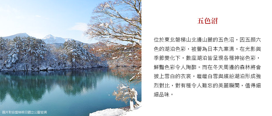 【五色沼】是盤梯山噴火所形成、20至30個沼澤的湖群總稱,湖水清麗秀美,顏色塊麗而富有變化,色彩有如渲染的畫一般,由翠綠、湛藍、深紫、咖啡等美麗的顏色交織而成,每個沼澤會有不同的顏色,路線兩旁全是天然原始的樹林,秋天時湖水的顏色和楓葉的紅,相映成趣,成為無與倫比的美麗景致。
